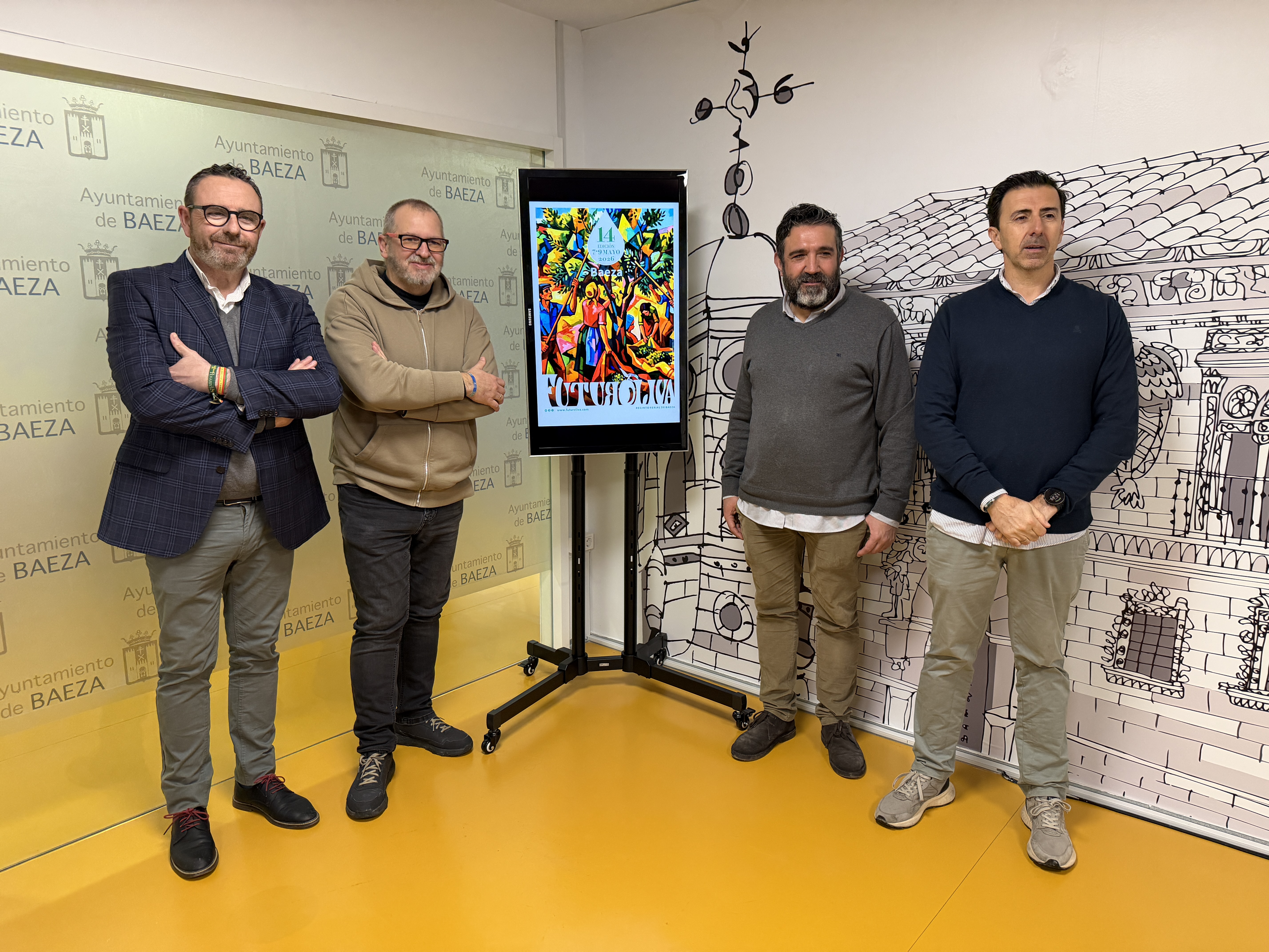El Ayuntamiento de Baeza ha presentado el cartel de la Feria que ha contado con la presencia de Sebastián Moreno y Santiago Calvo, responsables de la organización de Futuroliva y propietarios de Pópulo Servicios Turísticos. Así mismo, han asistido Antonio Sánchez Ruiz, de Artifactum, autor del cartel y el concejal de Agricultura del Ayuntamiento de Baeza, Antonio Perales.