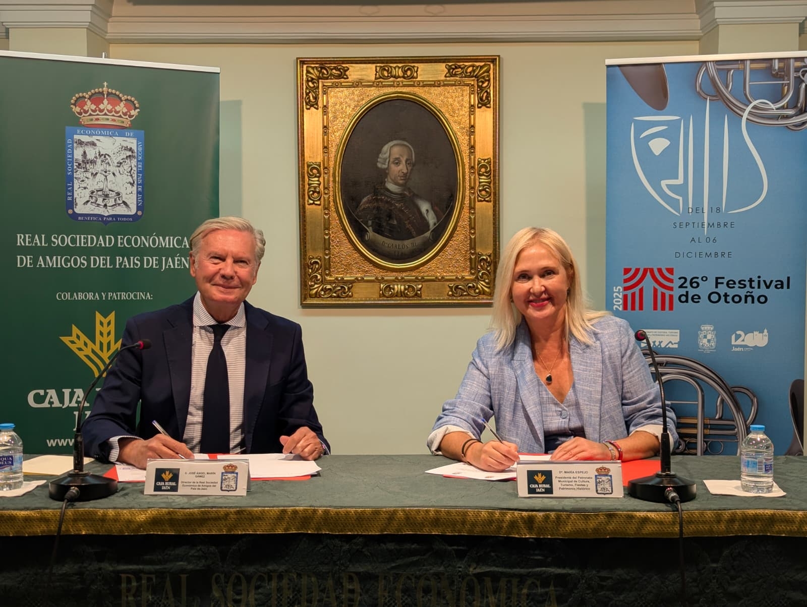 La teniente de alcalde y concejal de Cultura y Turismo, María Espejo, ha firmado un convenio de colaboración con la Real Sociedad Económica de Amigos del País para la celebración del 26 Festival de Otoño de Jaén.