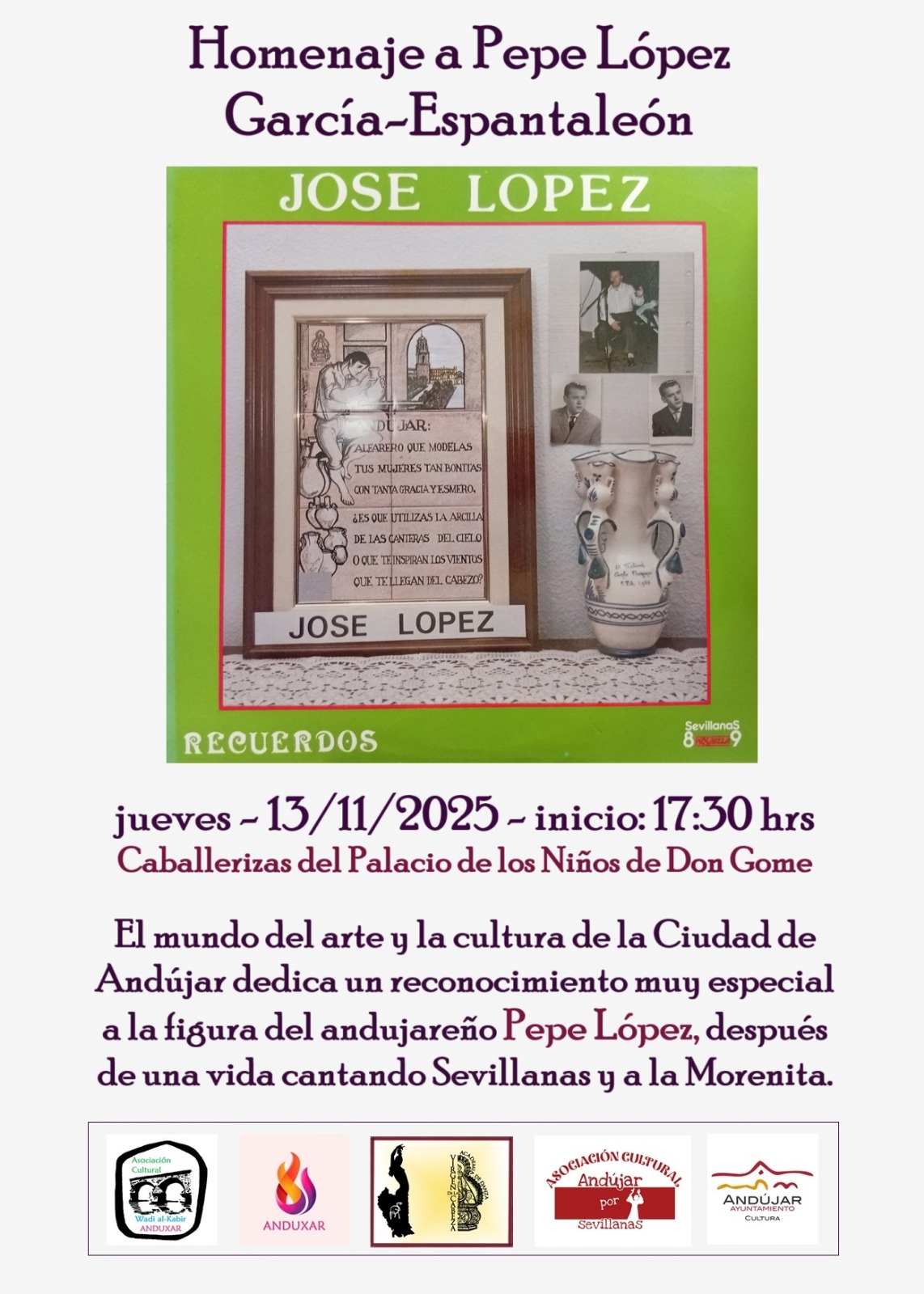 La sala de las caballerizas del Palacio de los Niños de Don Gome acogerá este jueves un cariñoso homenaje a José López García-Espantaleón, conocido artísticamente como Pepe López, quien la semana próxima celebrará su 80 cumpleaños y que recibirá una nueva muestra de cariño de su pueblo, en esta ocasión, a través de la Asociación Cultural Anduxar.