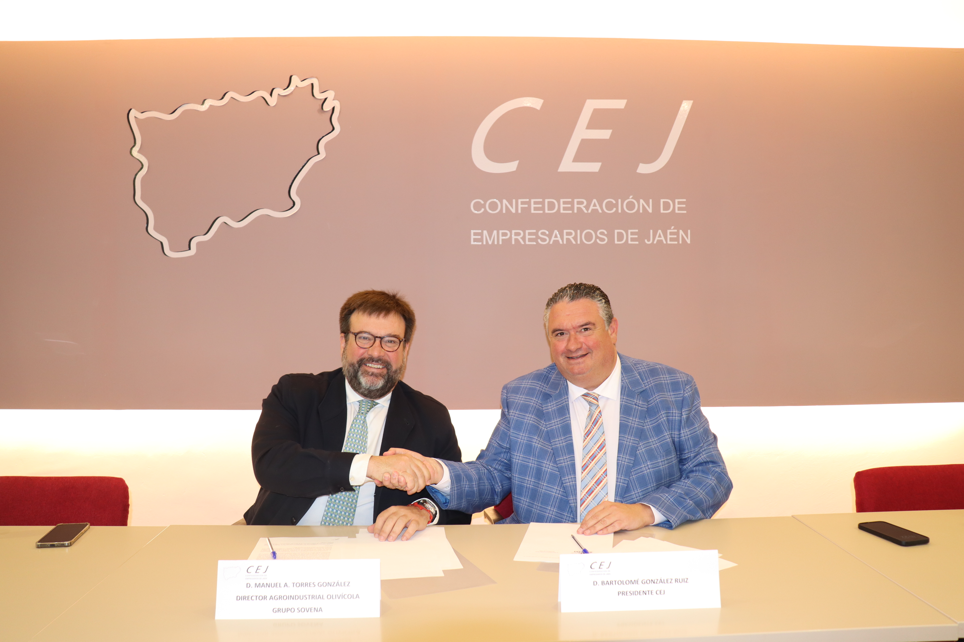 La Confederación de Empresarios de Jaén (CEJ) y el Grupo Sovena, referente internacional en la producción y exportación de aceite de oliva y girasol, han suscrito un convenio de colaboración y adhesión con el objetivo de fortalecer los vínculos entre el tejido empresarial jienense y una de las compañías más consolidadas del sector agroalimentario mundial. Bartolomé González, presidente de la CEJ, y Manuel Alfonso Torres, director agroindustrial olivícola de Grupo Sovena, han sido los encargados de rubricar el acuerdo en la sede de la organización empresarial.