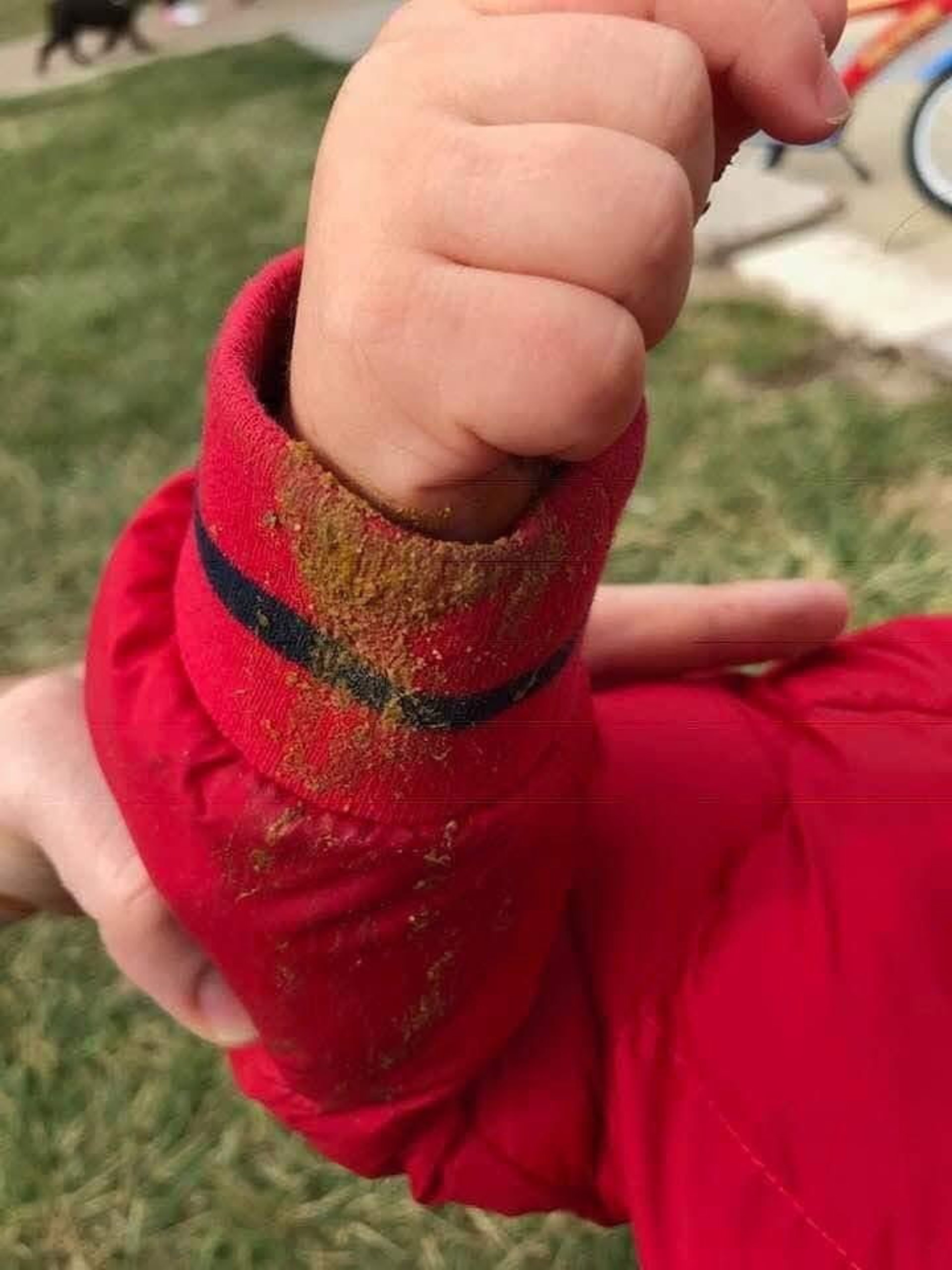 Niño manchado con restos de excrementos de perro.