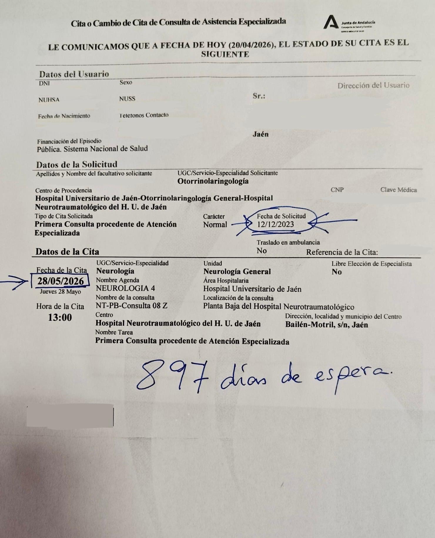 La candidata al Parlamento andaluz se refiere al caso de un paciente jiennense al que derivaron a Neurología en diciembre de 2023 y al que le han dado cita para finales del próximo mes de mayo, es decir, más de 2 años y medio después. "Casi 900 días esperando con la angustia de una patología sin diagnóstico y sin tratamiento. Y, lo que es peor, sin saber si es grave, si el tiempo juega en contra o si la vida se nos escapa mientras las puertas de los hospitales se nos cierran", resume.