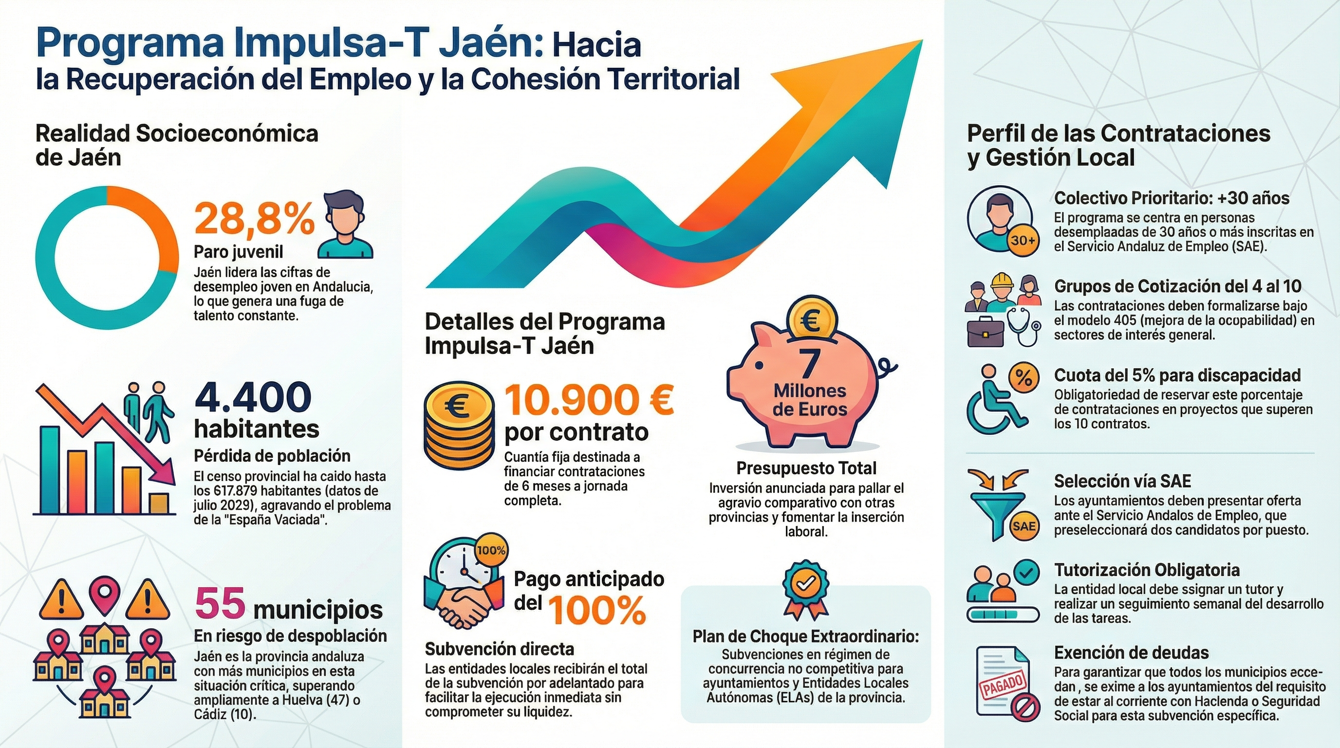 El partido provincialista Jaén Merece Más (JM+) ha valorado hoy positivamente la publicación en el Boletín Oficial de la Junta de Andalucía (BOJA) de la Orden que aprueba las bases reguladoras del Programa Impulsa-T Jaén, un plan de choque específico para el fomento del empleo en la provincia. No obstante, la formación califica la medida como "agridulce", al considerar que llega tarde y solo tras una intensa presión política ejercida desde finales de 2024.