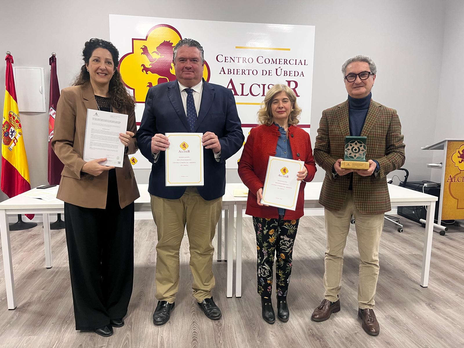 La Junta de Andalucía ha renovado el reconocimiento oficial del Centro Comercial Abierto (CCA) de Úbeda, que gestiona la Asociación de Comercio, Industria y Servicios (Alciser), el más antiguo de la provincia, de los más veteranos de Andalucía y un referente en una excelente gestión en pro de la cohesión e impulso del sector. Así lo ha destacado la delegada territorial de Empleo, Empresa y Trabajo Autónomo, Ana Mata, en el acto de presentación de esta renovación ─en el que también han participado el presidente de Alciser, Bartolomé González, y la alcaldesa, Antonia Olivares─, que tramitó y aprobó la Consejería de Empleo en el pasado mes de enero, y que se regula con una nueva normativa con la que el Gobierno andaluz pretende agilizar los trámites y reducir la carga burocrática.