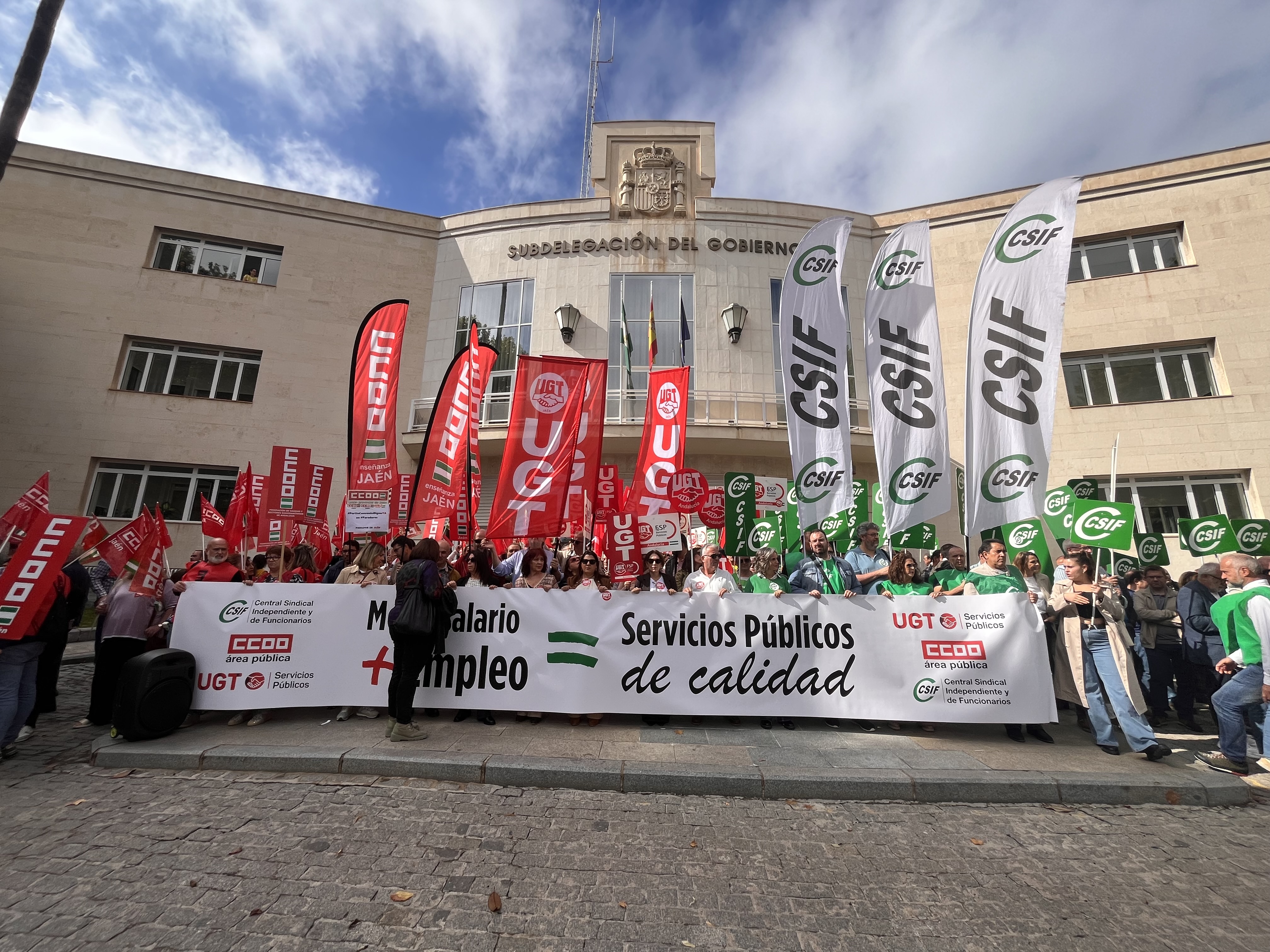 Los sindicatos CSIF, CCOO y UGT se han manifestado este jueves en las puertas de la Subdelegación del Gobierno para exigir al Gobierno de España "unos servicios públicos de calidad, incrementos salariales, más empleo y mejora de las condiciones laborales para más de tres millones y medio de empleadas y empleados públicos".