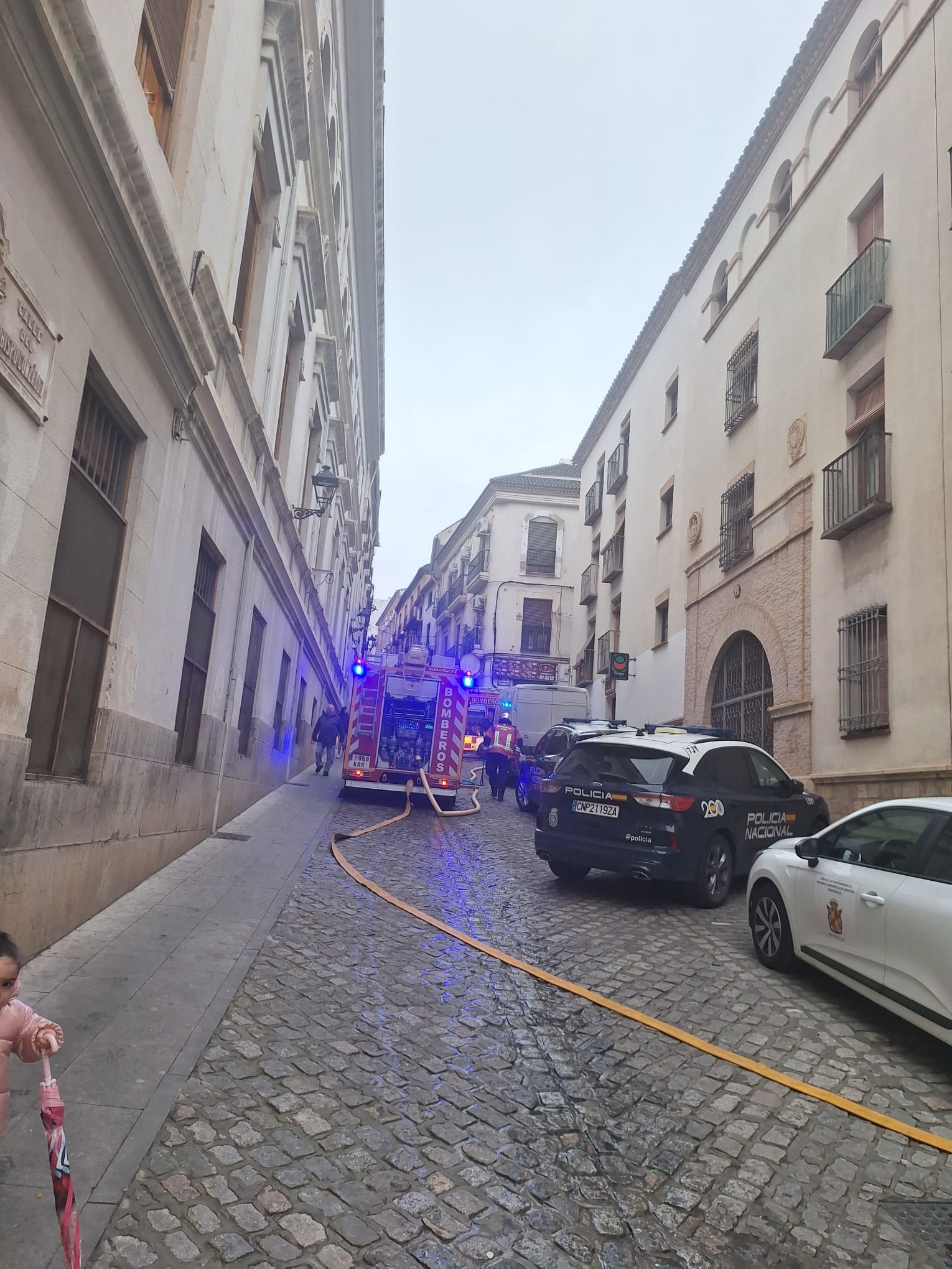Acaban de llegar los Bomberos y la Policía Local, que están actuando desde Obispo González, para tratar de sofocar las llamas e impedir que afecte a otros inmuebles.