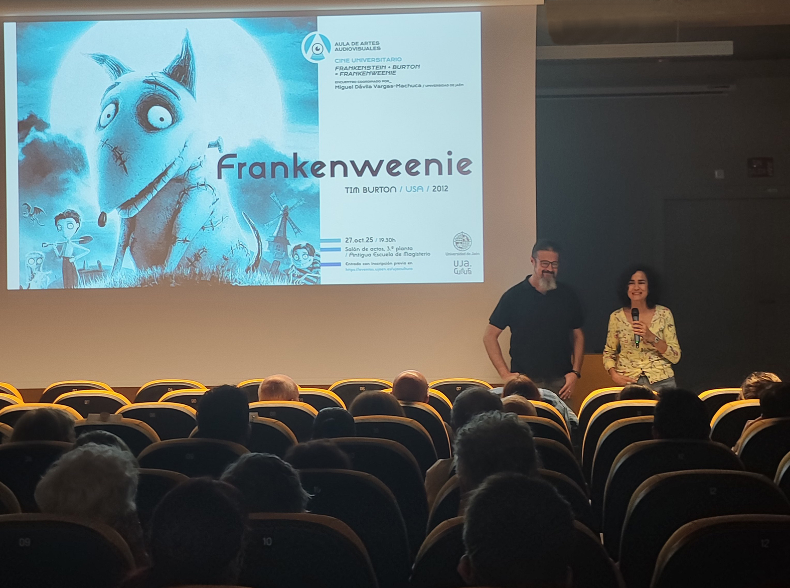 El cine universitario ha comenzado su andadura este curso 2025/2026 con el encuentro coordinado por Miguel Dávila Vargas-Machuca celebrado este pasado 27 de octubre, en el que se proyectó 'Frankenweenie' (Tim Burton, 2012). La proyección tuvo lugar en el Salón de Actos del edificio de Magisterio, lugar habitual donde se desarrolla esta actividad que se enmarca en el Aula de Artes Audiovisuales del Vicerrectorado de Cultura de la Universidad de Jaén. El visionado de la película estuvo acompañado de la presentación de Miguel Dávila y de un coloquio posterior, como viene siendo habitual en las veladas de cine universitario.