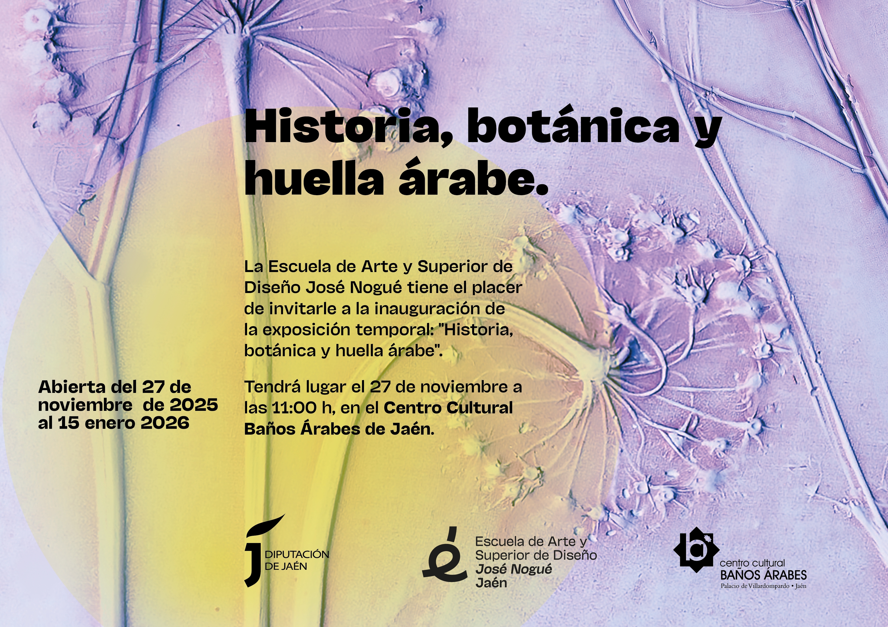La Escuela de Arte y Superior de Diseño José Nogué presenta la exposición 'Historia, botánica y huella árabe' en el Centro Cultural Baños Árabes de Jaén, un enclave donde "el pasado dialoga con el presente a través del arte, la historia y el patrimonio". La inauguración tendrá lugar el 27 de noviembre a las 11:00 horas y la muestra permanecerá abierta al público hasta el 15 de enero de 2026.