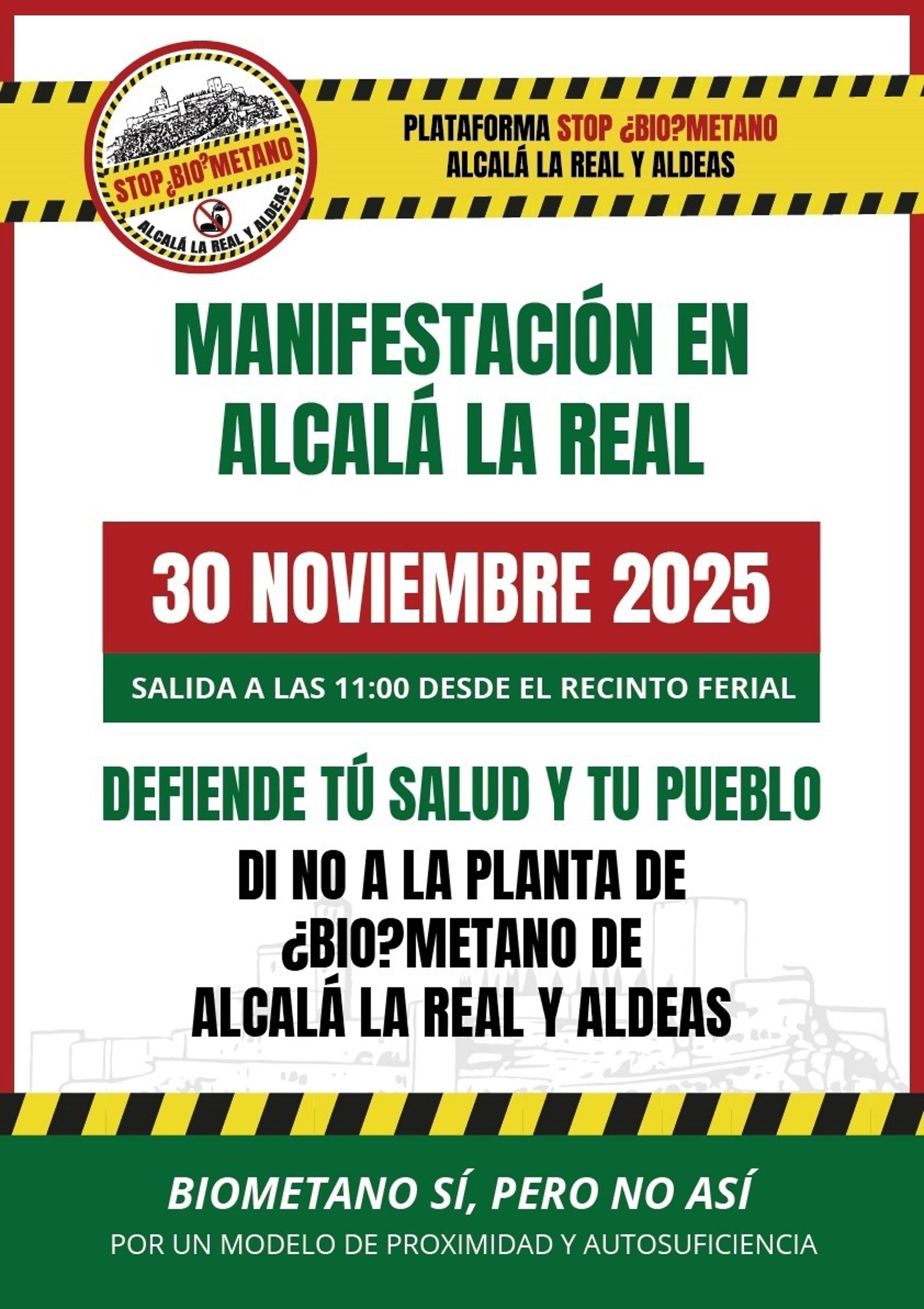 La Plataforma Stop Biometano de Alcalá la Real (Jaén) y aldeas ha convocado para este domingo, 30 de noviembre, una manifestación "en defensa de la salud, el medio ambiente y el futuro del municipio". El recorrido comenzará a las 11,00 horas en el recinto ferial para acabar a las puertas del Ayuntamiento.