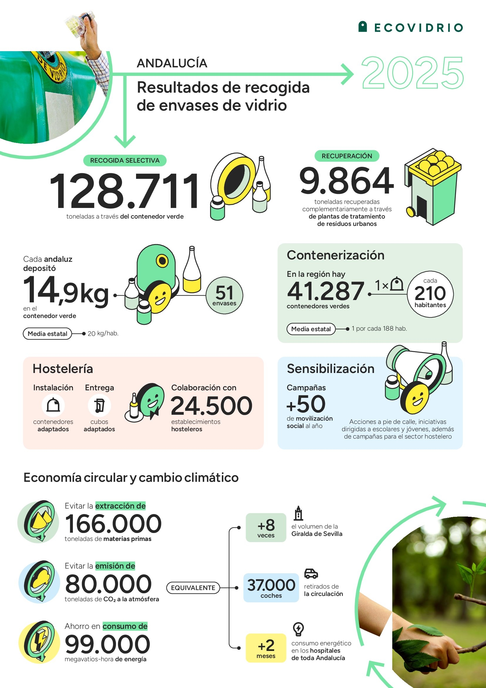 En Andalucía, la recogida selectiva de envases de vidrio registró un total de 128.710 toneladas durante 2025. Así, cada andaluz depositó en el contenedor verde 14,9 kg de envases de vidrio (unos 51 envases por persona), cifra que mantiene a Andalucía muy por debajo de la media nacional (20 kg/hab y 68 envases por persona).
