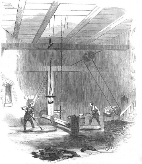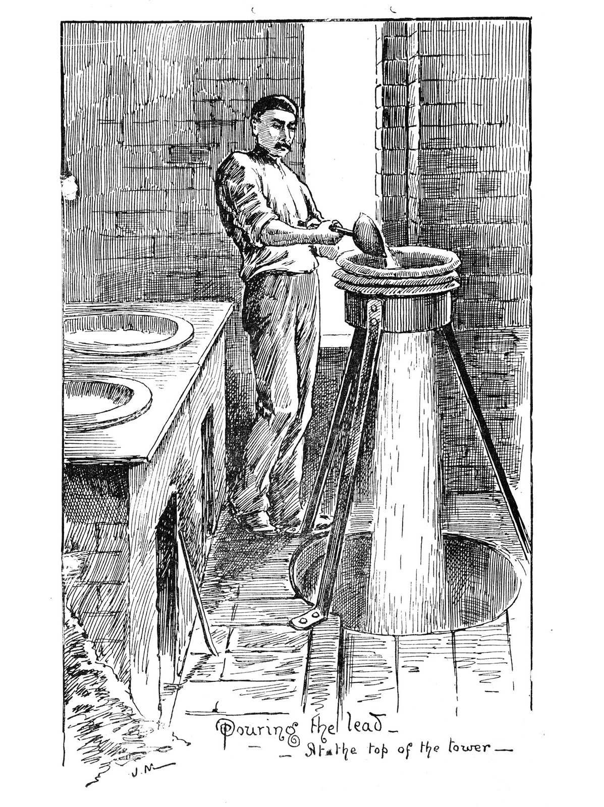 En una de estas torres, el plomo se calentaba hasta fundirlo, y luego se dejaba caer a través de un tamiz de cobre en lo alto de la torre. El plomo líquido formaba pequeñas bolas esféricas perfectas por tensión superficial y se solidificaba al caer. Las bolas parcialmente enfriadas se recogían en la base de la torre, en una cubeta llena de agua. Para el control de calidad se utilizaban tableros inclinados, las bolas buenas rodaban rápidamente hacia abajo y las deformes no lo hacían o con más dificultad.
